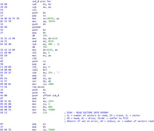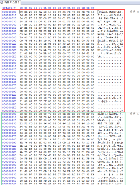 When malware infects a system, what happens first is a malicious ShellCode being overwritten in the MBR area. As seen in Figure 2 below, the malware copies the normal boot code of sector 0 to sector 1 and overwrites sector 0 and sector 2 – 54 area with ShellCode. The red box indicates the sector overwritten after infection, and the green box is the normal MBR code before it was compromised.