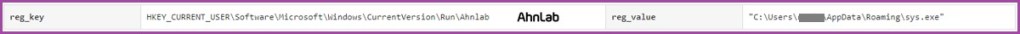 Lastly, it registers Run key to maintain its persistence when PC is rebooted. To be noted, the name of the key is “Ahnlab” as shown below.
