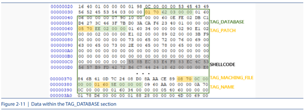 TAG_DATABASE section provides information including shellcode and SDB file execution target process. [Fig 2-11] shows the data listed within the TAG_DATABASE section.