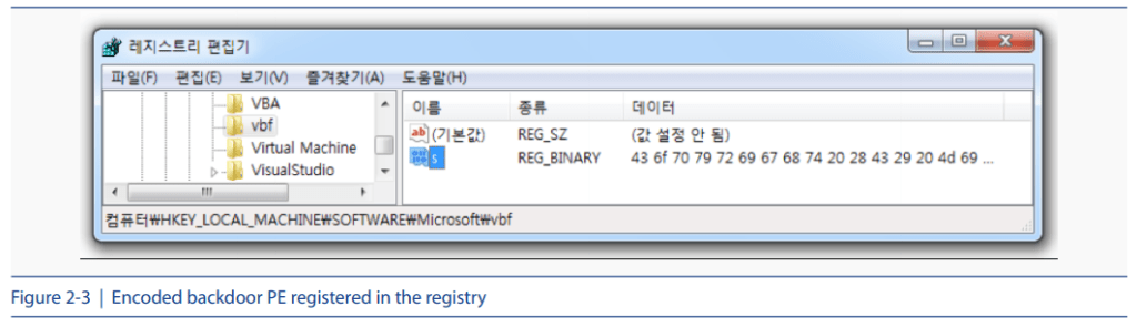 This way, the SDB-based malware writes the encoded backdoor malware in the registry, as shown in [Fig2-3]. The encoded backdoor is registered to the registry path ‘HKLM\SOFTWARE\ Microsoft\[randum string].’