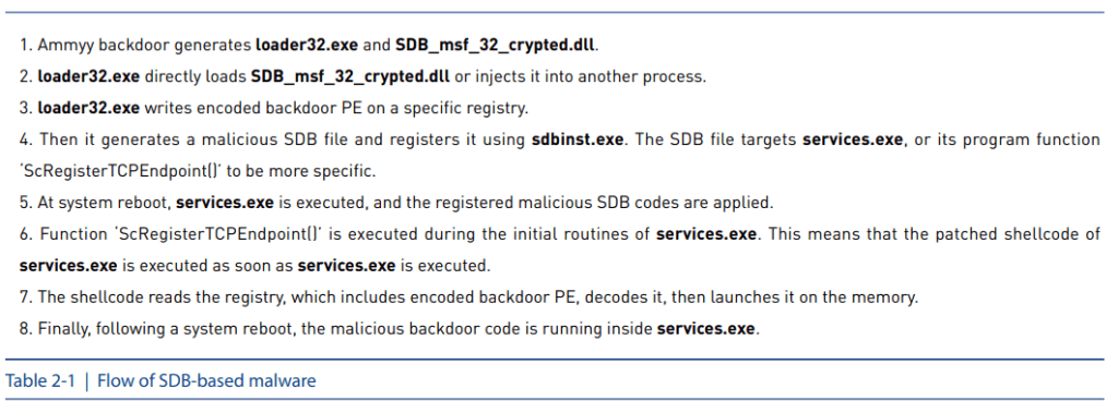 [Table 2-1] shows an overview of malware flow utilizing the SDB file.