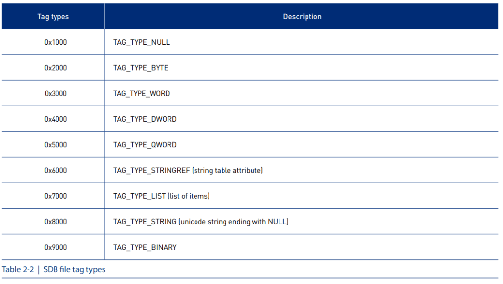 Tags are generally followed by the ‘data-size’ or ‘actual data.’ However, the values in the string table must be referenced to identify tags starting with ‘0x6,’ as shown by the SDB file tag types in [Table 2-2].