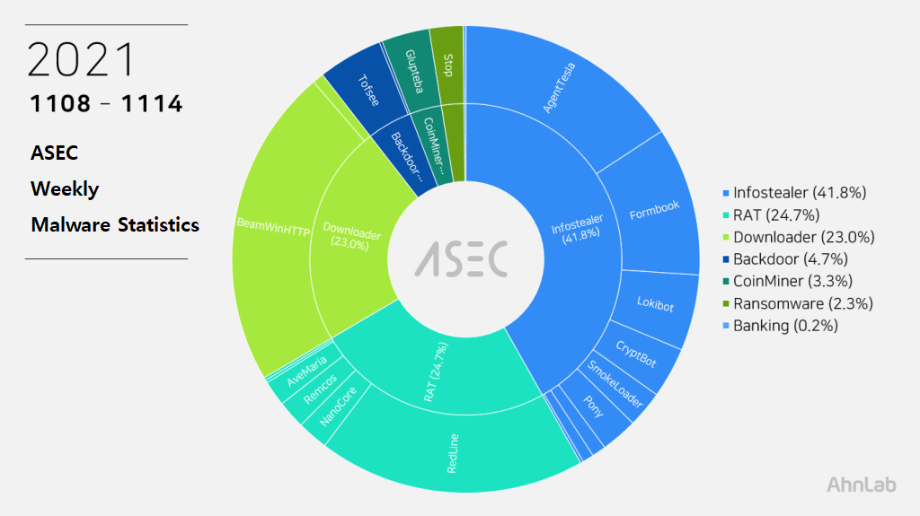 The ASEC analysis team is using the ASEC automatic analysis system RAPIT to categorize and respond to known malware. This post will list weekly statistics collected from November 8th, 2021 (Monday) to November 14th, 2021 (Sunday).