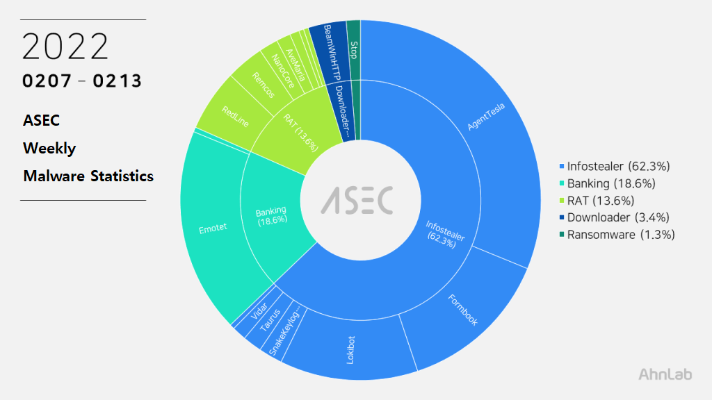 The ASEC analysis team is using the ASEC automatic analysis system RAPIT to categorize and respond to known malware. This post will list weekly statistics collected from February 7th, 2022 (Monday) to February 13th, 2022 (Sunday).