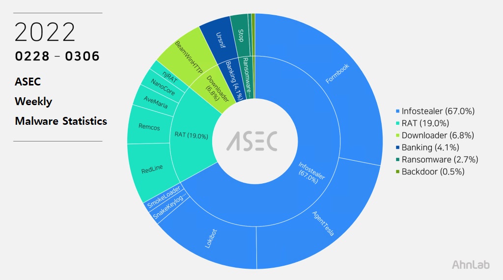 The ASEC analysis team is using the ASEC automatic analysis system RAPIT to categorize and respond to known malware. This post will list weekly statistics collected from February 28th, 2022 (Monday) to March 6th, 2022 (Sunday).