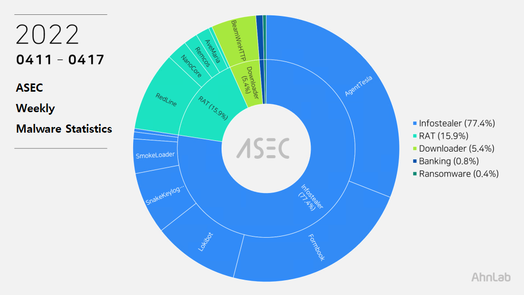 The ASEC analysis team is using the ASEC automatic analysis system RAPIT to categorize and respond to known malware. This post will list weekly statistics collected from April 11th, 2022 (Monday) to April 17th, 2022 (Sunday).