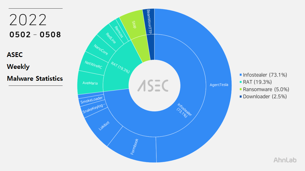 The ASEC analysis team is using the ASEC automatic analysis system RAPIT to categorize and respond to known malware. This post will list weekly statistics collected from May 2nd, 2022 (Monday) to May 8th, 2022 (Sunday).