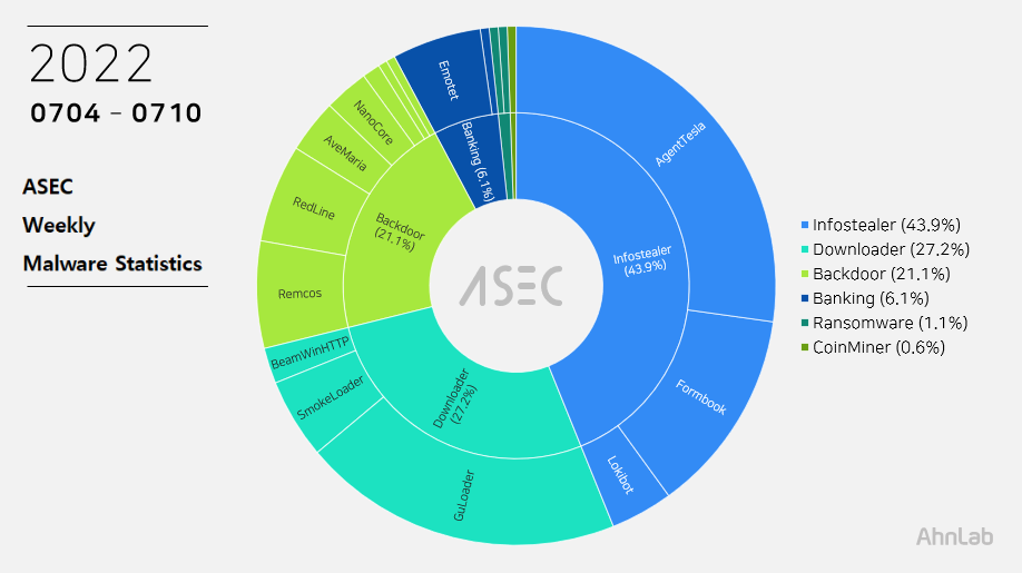 The ASEC analysis team is using the ASEC automatic analysis system RAPIT to categorize and respond to known malware. This post will list weekly statistics collected from July 4th, 2022 (Monday) to July 10th, 2022 (Sunday).