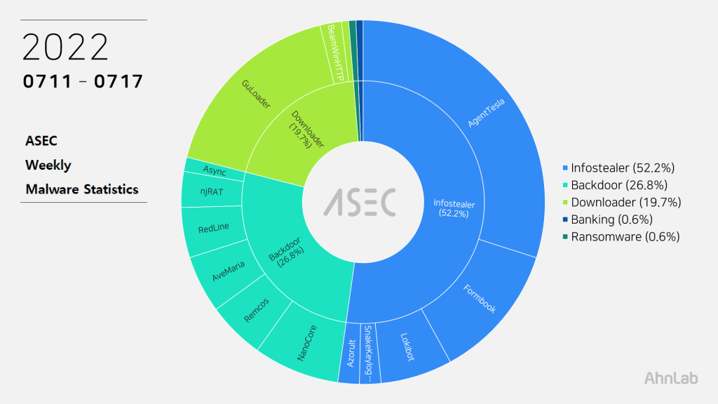 The ASEC analysis team is using the ASEC automatic analysis system RAPIT to categorize and respond to known malware. This post will list weekly statistics collected from July 11th, 2022 (Monday) to July 17th, 2022 (Sunday).