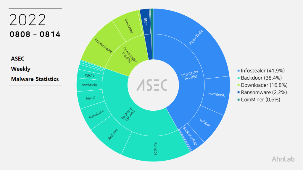 The ASEC analysis team is using the ASEC automatic analysis system RAPIT to categorize and respond to known malware. This post will list weekly statistics collected from August 8th, 2022 (Monday) to August 14th, 2022 (Sunday).