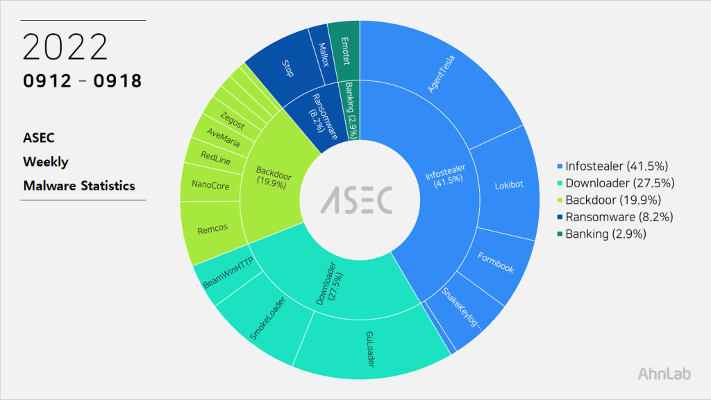 The ASEC analysis team is using the ASEC automatic analysis system RAPIT to categorize and respond to known malware. This post will list weekly statistics collected from September 12th, 2022 (Monday) to September 18th, 2022 (Sunday).