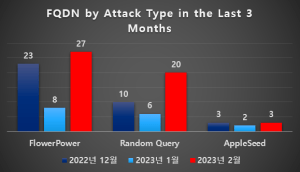 Compared to the number of FQDNs in the January 2023 Threat Trend Report on Kimsuky Group published on March 3, 2023, the FQDNs of all attack types showed a 3-fold increase. The most commonly detected types were FlowerPower, Random Query, and AppleSeed, in order.