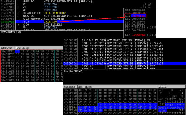 ASUSインストールファイルによってマルウェアをダウンロードする形態に2種類が確認され、インストールファイル内部に存在する実行ファイル(AsusShellCode.pdb形式のPDB情報を含む)によってダウンロードされる形と、実行ファイルがなく、シェルコードによって直接ダウンロードする方式がある。インストールファイル内部に含まれているダウンロード機能の実行ファイルも、ファイル形態で生成されるのではなく、メモリ上にのみ存在する構造であり、以下のようなPDB情報を持つ。