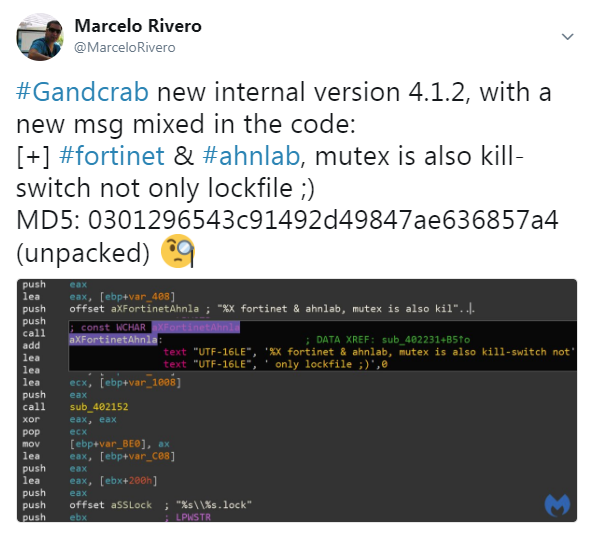 2018年7月9日、セキュリティベンダーのFortinetと、7月13日、アンラボにおいてGandCrab v4.1.1に対する暗号化のブロック方法を共有した。その後、7月17日に以下のようなGandCrab 4.1.2バージョンが新しく確認され、マルウェア内部にはFortinetとアンラボを嘲笑するかのようなフレーズが挿入されていた。