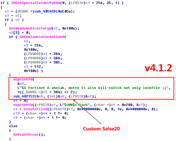 以下の[図1]のように新しいバージョン4.1.2で*.lockファイルを生成するコードを示している。赤枠で表示した部分が新たに追加されたものであり、従来のボリューム情報以外にSalsa20関数によってlockファイル名を生成していることがわかる。