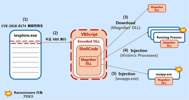 現在、拡散している Magniberも最終段階の wuapp.exe へのインジェクションに失敗した場合に限り、iexplorer.exe 自身にランサムウェアをインジェクションするコードが存在するが、これは実際の感染環境では発生しにくい構造であり、上図では除外している。
