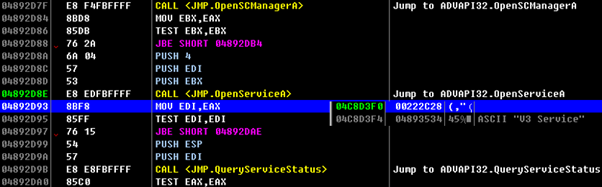 従来の GandCrab はアンチウイルスを削除する機能がキャプチャコードの適用により削除が不可能になると、アンチウイルスを終了させる方法へと手段を変更した。[図7] のように「V3 Service」という名前のサービスを検索して V3 の実行有無を確認し、実行中の場合は15分間待機(Sleep()関数)した後、V3 製品に対するサービス終了を試みる。