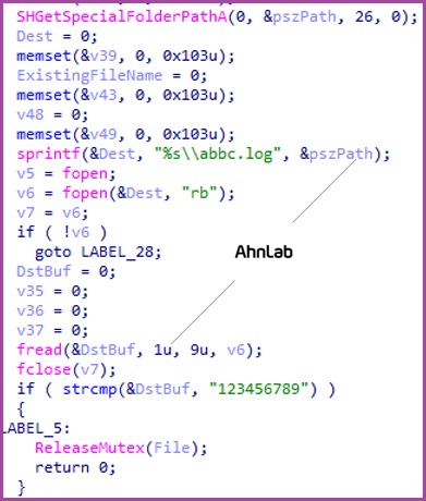 ダウンローダーマルウェアは、まず Anti-Sandbox の手法を使用するが、分析環境において当該ファイルを単独で実行した場合は、不正な行為を実行しないように、AppData\Roaming フォルダで「123456789」が書かれた abbc.log ファイルを読んで内容を確認する。すなわち、sys.exe ファイルを単独で実行した時にはすぐに終了し、ドロッパーを通して実行させる場合にのみ不正な行為が実行される。