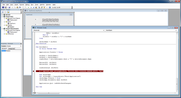 VBA コードは、AutoOpen() 関数を利用する。実行すると最初に実行した文書ファイルを削除して、「<ファイル名>.doc」の名前で正常な文書ファイルをシステムに作成してユーザーに対して表示すると同時に、不正な DLL ファイルをx64/x86を区分してシステムに生成および実行する。生成に必要なバイナリデータは、UserForm に Base64 でエンコードされている。DLL ファイルのパスは Microsoft パスを偽装する。