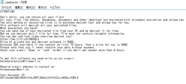 以下の [図2] は _readme.txt という名前で生成されたランサムノートである。