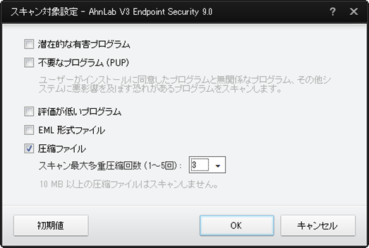 V3 製品は、[環境設定 > スキャン設定 > 指定スキャン > スキャン対象設定]で圧縮ファイルにチェックを入れれば診断されることが確認できる。