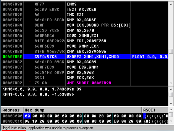 この「VXORPS」コマンドは、AVX(Advanced Vector eXtensions) コマンドセットに含まれているものであり、浮動小数点を利用した XOR 論理演算子である。このコマンドを CPU が処理するためには AVX コマンドセットに対応する CPU および OS を使用しなければならない。