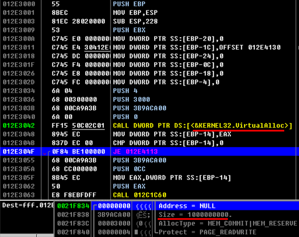 この手法は VirtualAlloc() API を利用して0x3B9AC00(およそ1GB)ほどのメモリを割り当てる。このサイズを割り当てられなかった場合は無効なアドレスを参照するようにし、強制的に Crash を発生させる。