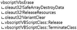 [図7] の1番の Erase 部分は、内部的に [図11] のような関数を呼び出す。oleaut32!ReleaseResources 関数はFreedObjectArray 配列を巡回し、保存された値を初期化する機能を実行する。そして、oleaut32!VariantClear 関数は Variant 構造体を初期化する関数である。VariantClear 関数は Variant 構造体の VT 値に応じて Clear するルーティンが異なる。Variant 構造体の VT 値が DISPATCH であるため、VBScriptClass::TerminateClass が呼び出される。[図7]の Erase 関数が呼び出されるタイミングは、メモリが割り当てられてすぐに解放される時であり、参照回数は [図11] のように1となる。その後 TerminateClass が呼び出され、初期化関数を経て、[図7] の2番のコールバック関数に移動する。