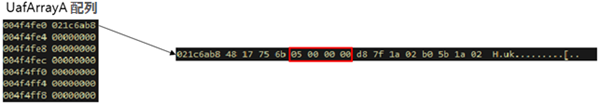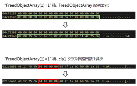 初期化された cla1 配列の参照回数は4であり、[図7] の2番の部分で Set 部分は cla1 オブジェクトのアドレス情報を持っている FreedObjectArray 配列を UafArrayA に割り当てて参照回数を1増加させる。UafArrayA に保存されたアドレス値が Dangling pointer に使用される [図13]。