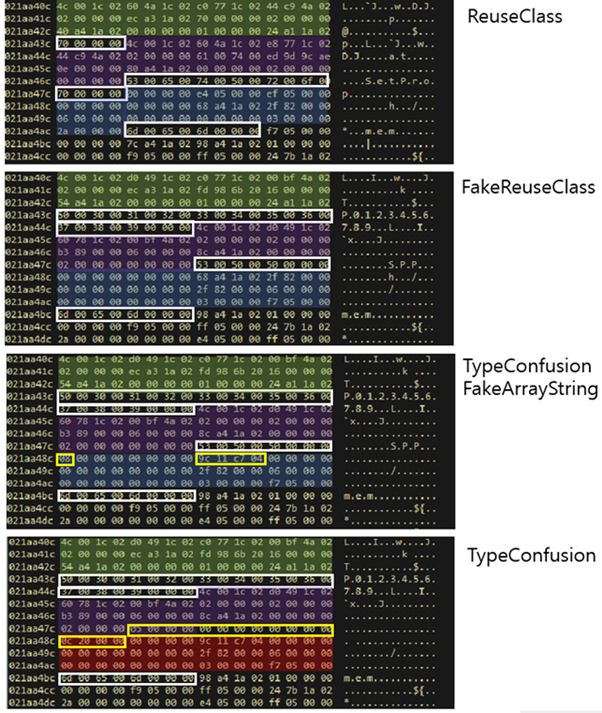 CVE-2018-8174の脆弱性において、Use After Free は2回実行され、2つの Dangling Pointer が発生し、また ReuseClass に2回割り当てられる。Use After Free の部分では方法と原理に差異がないため1つだけ説明したが、TypeConfusion では2つそれぞれの使用方法が異なる。まず最初の方法を説明し、続いて相違点を後述する。