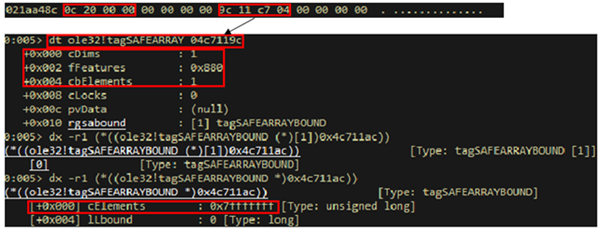 FakeReuseClass オブジェクトに割り当てた objectImitatingArray の mem に、あらかじめ構成された FakeArrayString で上書きする。FakeArrayString は String で構成された値(0x08,BSTR)で、正常でないサイズの tagSAFEARRAY を作成するために構成された値である。書き込まれた値である FakeArrayString は、BSTR であるため、mem の VT 値が0x08に変更される。この中で0xFFFF、0x7FFFの値があるが、この値は TypeConfusion を実行する時に SafeArray 配列のサイズを0x7FFFFFFFサイズで作成するために構成された値である。また、0x0001と0x0880、0x0001の値があるが、この値は tagSAFEARRAY 構造体の1番目、2番目、3番目の引数値として設定され、それぞれ配列の次元情報、配列のフィーチャー情報、配列の要素のサイズ値となる。このようにして構成された値を objectImitatingArray の mem 変数に上書きする。このように上書きを行うと、以下の [図18] のように変更された tagSAFEARRAY 構造を確認できる。したがって、変更された tagSAFEARRAY は1次元配列の0x880( FADF_VARIANT | FADF_HAVEVARTYPE )属性と配列要素のサイズが1である0x7FFFFFFF個の配列を持つようになる。規定のプロパティ関数が終了し、SetProp に戻って定義された mem を構成された Q の値に ReuseClass の mem の位置に上書きし、タイプが0x08(BSTR)から0x200C(ARRAY, VARIANT)に変更される。その後、reuseObjectA_arr の mem を呼び出すと0x7FFFFFFFサイズの配列を使用できるようになる。正常でないサイズのこの配列は、スクリプトがロードされた iexplore.exe のヒープ領域と同じサイズのメモリにアクセスすることができる。