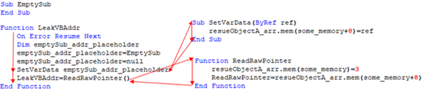 LeakVBAddr 部分では、先に実行した TypeConfusion で作成された配列(resueObjectA_arr)とヒープ領域のアドレス(resueObjectB_int)を利用して VBScript.dll の base addresss を取得する。