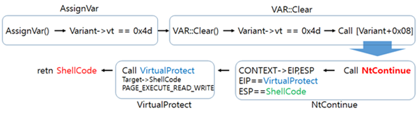 シェルコードは0x4D値を割り当てて実行される。0x4D値を割り当てると AssignVar が呼び出され、Variant 構造体の VT 値を確認して値に応じた分岐を行う。VT 値が0x4Dのときは VAR::Clear が呼び出され、構成されたメモリによって NtContinue と VirtualProtect でシェルコードまで実行される。