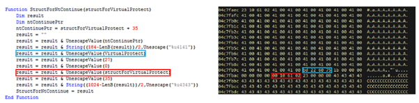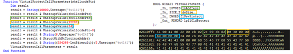[図25] は、VirtualProtect でシェルコードに実行権限を付与するためにメモリを構成するスクリプトである。VirtualProtect は対象アドレス、サイズ、保護オプションによって呼び出される。実行権限として64(0x40)が使用される。これは、PAGE_EXECUTE_READWRITE 権限である。