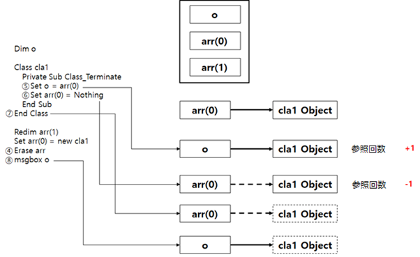 [図4] のスクリプト内容のうち、1番の Dim は変数の宣言であり、グローバル変数 o を宣言する。2番の Redim の意味は配列の宣言であり、arr で命名した2個の配列が宣言される。3番のプロセスによって cla1 クラスオブジェクトを、宣言された最初の配列 arr(0) に割り当てる。このプロセスによって、最初の配列 arr(0) に cla1 クラスオブジェクトのアドレスが保存され、クラスオブジェクトに対する参照回数(参照カウント)は1となる。