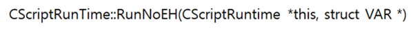 P-Code は RunNoEH 関数で実行され、[図1] の最初のパラメータである CScriptRuntime クラスの内部に位置する。CScriptRuntime クラスは [図2] の通りで、0xC0に位置するメンバ変数 Compiled Script によって P-Code の位置が分かる。[図2] の0xB4に位置するメンバ変数 Position Counter は、次に実行する P-Code コマンドを指している。これは、EIP レジスタに類似した役割を実行する。