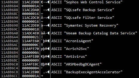 そして複数のサービス、プロセスを終了させる。終了対象リストは Adobe、MSSQl、MSExchange 等の正常なプログラムだけでなく、複数のセキュリティプログラムもその対象となる。