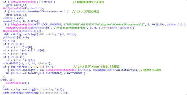 デコードされた PE は Anti-SandBox 機能が存在する情報流出型マルウェアである。マルウェアは以下の情報を確認して一つでも満たしている場合は、自分自身のプロセスを終了する。