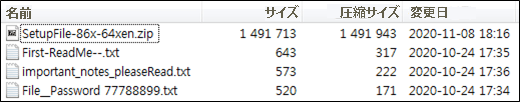 マルウェアは、ユーティリティ名_特定ハッシュ値.zip の形式でダウンロードされる。圧縮ファイルには情報流出型マルウェアが含まれる SetupFile-86x-64xen.zip 圧縮ファイルと、圧縮パスワードが含まれた txt ファイル、マルウェアの実行を誘導する ReadMe.txt ファイルが格納されている。