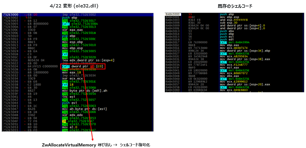 シェルコードの変化プロセスとインジェクション対象の変化について簡単に調べたところ、4月22日に攻撃者はシェルコードの難読化によって、4月15日のエンジンで配布された V3 メモリ検知の回避を試みていた。
