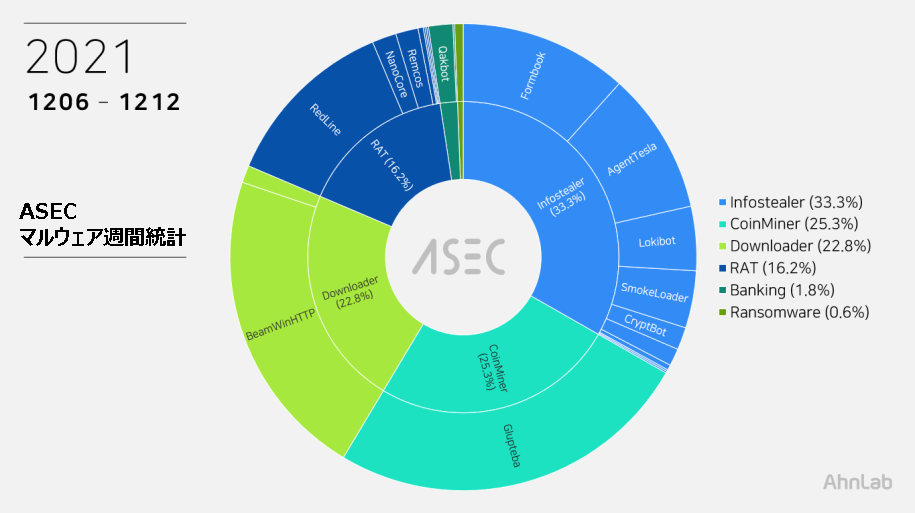 ASEC 分析チームでは、ASEC 自動解析システム RAPIT を活用し、既知のマルウェアに対する分類および対応を進めている。本記事では、2021年12月6日(月)から12月12日(日)までの一週間で収集されたマルウェアの統計を整理する。