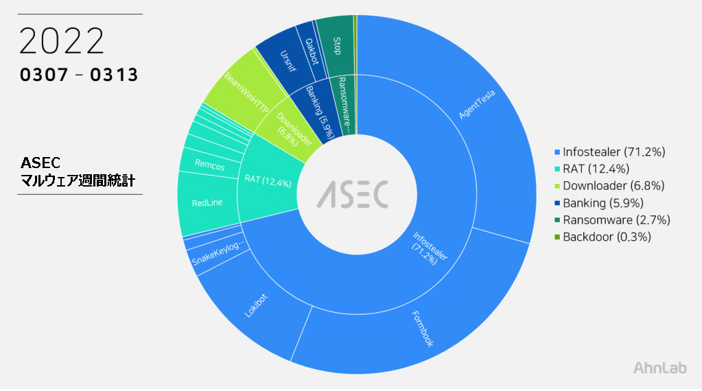 ASEC 分析チームでは、ASEC 自動解析システム RAPIT を活用し、既知のマルウェアに対する分類および対応を進めている。本記事では、2022年3月7日(月)から3月13日(日)までの一週間で収集されたマルウェアの統計を整理する。