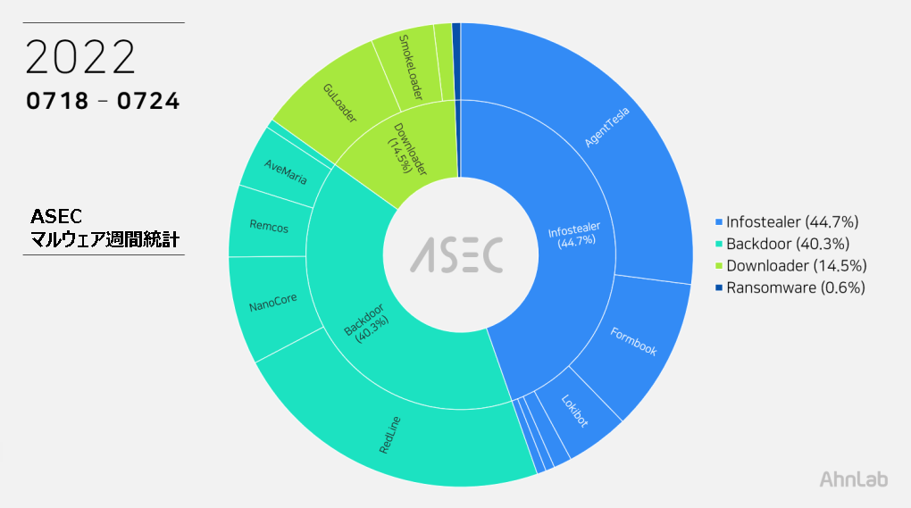 ASEC 分析チームでは、ASEC 自動解析システム RAPIT を活用し、既知のマルウェアに対する分類および対応を進めている。本記事では、2022年7月18日(月)から7月24日(日)までの一週間で収集されたマルウェアの統計を整理する。