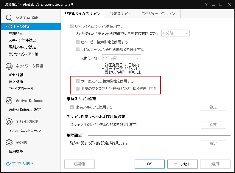 現在 AhnLab では Magniber ランサムウェアに対して、ファイル検知だけでなく、様々な検知方法により対応を行っている。したがって、ユーザーは[V3 環境設定] – [PC スキャン設定]でプロセスのメモリ検知の使用、不正なスクリプト検知(AMSI)の使用オプションを有効化して使用することを推奨する。