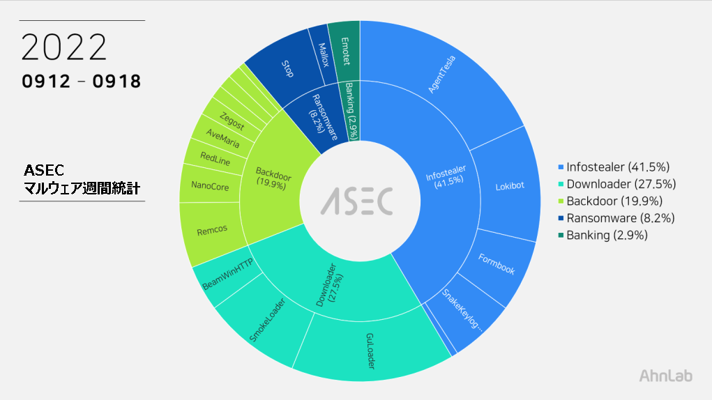 ASEC 分析チームでは、ASEC 自動解析システム RAPIT を活用し、既知のマルウェアに対する分類および対応を進めている。本記事では、2022年9月12日(月)から9月18日(日)までの一週間で収集されたマルウェアの統計を整理する。