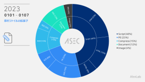 2023年1月1日から1月7日までの一週間の配布事例である。偽のログインページタイプと情報流出、ダウンローダー、脆弱性、バックドアを含むマルウェアタイプを分けて紹介する。メールの件名と添付ファイル名に表示される数字は一般的なものであり、固有 ID 値としてメールの受信者に応じて異なる場合がある。ハングルの件名の配布事例も確認された。グローバルに英文の件名および内容を配布するのではなく、韓国国内のユーザーを対象にした事例である。
