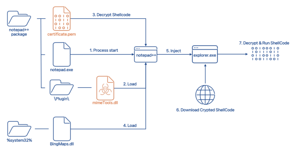 - 不正な振る舞いは、ユーザーが Notepad++ を実行すると同時に、mimeTools.dll がロードされて始まる。