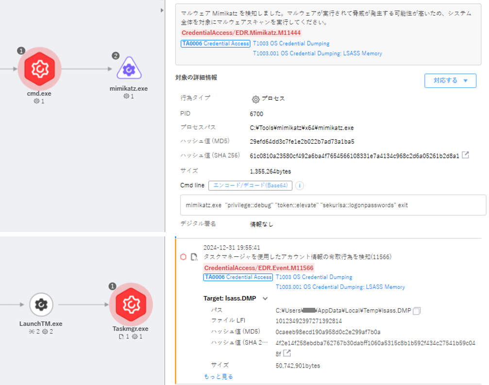 攻撃者はそのために Mimikatz を使用したり、タスクマネージャー(taskmgr.exe)を悪用したものと知られている。Mimikatz は、Windows OS 環境で資格情報を抽出する機能を持つプログラムである。オープンソースプロジェクトとして GitHub に公開されているため、攻撃者に愛用されており、サポートしている機能の中には、LSASS プロセスのメモリに保存されている NT Hash(NTLM 認証プロトコルで使用するハッシュ)を抽出する方法がある。